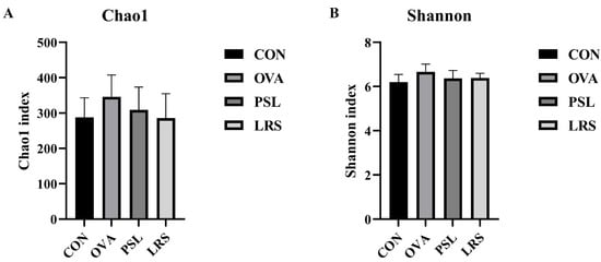 (A) The species richness estimate (Chao1) and (B) the diversity index (Shannon) of fecal samples from different groups. CON: control group without ovalbumin sensitization and challenge; OVA: allergic model group with ovalbumin sensitization and challenge; PSL: allergic model mice with prednisolone treatment; LRS: allergic model mice with lotus-seed resistant starch treatment.