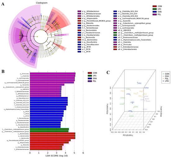 (A) Cladograms for the fecal microbial community generated from LEfSe analysis. Circles from the inside out represent taxonomic levels from phylum to genus. Each small circle at a different classification level represents a classification at that level, and the size of the small circle’s diameter is proportional to the size of the relative abundance. The species names represented in English are shown in the legend on the right. (B) LDA estimates the magnitude of the effect of the abundance of each species on the differential effect. The length of the bar chart represents the influence of significantly different species. The threshold of the logarithmic score of LDA analysis was 2.0. Differences between the control, model, prednisolone, and LRS groups. (C) Principal components analysis (PCoA) of 16S rRNA gene-sequencing analysis of fecal microbiota composition. CON: control group without ovalbumin sensitization and challenge; OVA: allergic model group with ovalbumin sensitization and challenge; PSL: allergic model mice with prednisolone treatment; LRS: allergic model mice with lotus-seed resistant starch treatment.