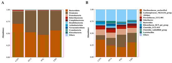 The differences in gut microbiota among groups at different levels. (A) Phylum level, (B) genus level. CON: control group without ovalbumin sensitization and challenge; OVA: allergic model group with ovalbumin sensitization and challenge; PSL: allergic model mice with prednisolone treatment; LRS: allergic model mice with lotus-seed resistant starch treatment.