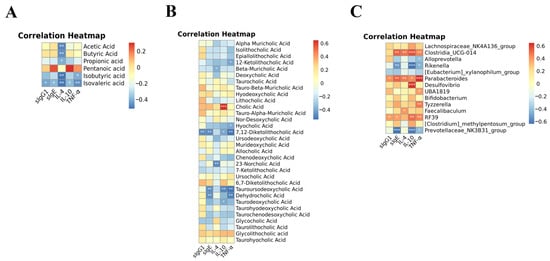 The correlation heatmaps represent significant statistical correlation values (r) between allergic responses and altered fecal short-chain fatty acid (A), altered fecal bile acids (B) and microbiota genera (C). * significant correlations with p < 0.05; ** p < 0.01, *** p < 0.001.
