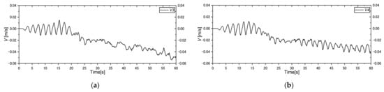 From this figure, we found that the velocity considerably moved along the alongshore direction at V4 and V5, and mostly at V5 in case 2 compared with in case 1, which could have occurred due to the wave breaking approximately nearest to the V5 (369 cm) position, as discussed in the above sections. The downstream flow was dominant in the vicinity of the V3 and V4 positions in case 2. The waves were approximately broken in the vicinity of the V6 measurement position in case 1; the longshore velocity was remarkably dominant at V5 and V6, and the downstream flow was dominant in the vicinity of the V4 and V5 measurement positions in this case. Additionally, we found the velocity in the opposite direction of rotation at V3 and V4 in case 3, which indicated that the downstream flow moved in the negative direction in this case. The longshore flow velocity in the alongshore direction was not dominant in case 4, and the velocity profiles remarkably fluctuated at all velocity gauges in case 4.