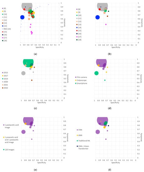 Sensitivity and specificity plots. AI: artificial Intelligence; ANN: artificial neural networks; CIN: cervical intraepithelial neoplasia; CNN: convolutional neural network; ROC: receiver operating characteristic. (a) Algorithms presented in the included studies with areas of the markers proportional to the sample sizes. The ROC curve of [14] is also represented. (b) Algorithms with the highest accuracy for each study. (c) Classification by year of publication. (d) Classification by acquisition device. (e) Classification by type and number of images per patient. (f) Classification by algorithm families. (g) Classification by cross validation technique. (h) Average experts’ performances compared to algorithms. * Classifying into normal or atypical including CIN1 and CIN2+. ** Classifying into CIN2+ and negative.
