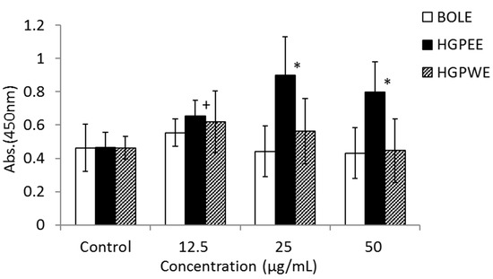 Human fetal epidermal keratinocytes were cultured in human epidermal keratinocyte growth medium. The cells were prepared at 60,000 cells/well, and 500 μL/well was seeded into a 24-well plate (Falcon; Thermo Fisher Scientific Inc., Waltham, MA, USA) and cultured for 1 day in the epidermal keratinocyte basic culture medium. Human hair papilla cells (Toyobo Co., Ltd., Osaka, Japan) were seeded into 75 cm2 flasks (3,000,000 cells/flask) and cultured for 1 day in a 10-mL human papilla cell growth culture medium. Next, a 100,000 cells/well, and 100 μL/well were placed in the cell culture insert for a 24-well plate (Falcon) and cultured for 1 day in the human papilla cell basic culture medium. The cells were cultured in human papilla cell basic culture medium containing the control, BOLE (at final concentrations of 12.5, 25, and 50 μg/mL), HGPEE (at final concentrations of 12.5, 25, and 50 μg/mL), HGPWE (at final concentrations of 12.5, 25, and 50 μg/mL), and minoxidil (at final concentrations of 5, 10, and 20 μg/mL) in the cell culture insert for 5 days. The cell culture insert was removed, a 50 μL/well was added to a Cell Counting Kit-8 (Dojindo Laboratories) to the lower layer, culturing proceeded for 2 h, and the number of the human epidermal keratinocytes was measured using a microplate reader (450 nm). Four replicate experiments were performed.