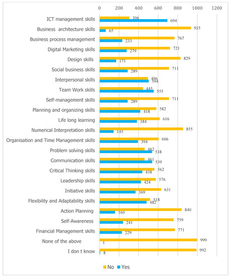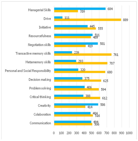 Regarding the skills necessary for women’s employability in the 21st century, the respondents indicated as crucial skills those related to ICT management, communication, problem solving, teamwork, and interpersonal skills. Respondents ranked in lowest positions business architecture, interpretation of numerical data, and operations planning skills (Figure 1).