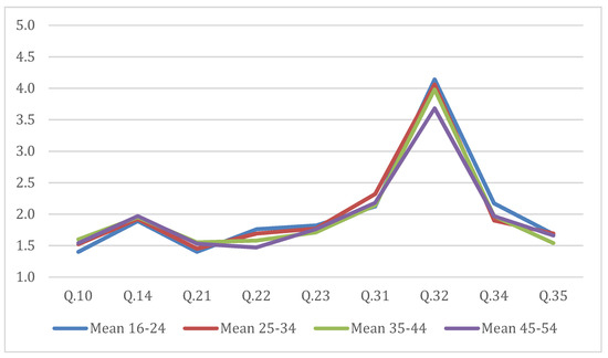 Moreover, the bivariate analysis revealed statistically significant differences in the difficulty women face in managerial and decision-making positions (Q10) (F (4, 994) = 7.06, p = 0.000), the assessment of women’s entrepreneurial capacity compared to men’s, based on women’s perception (Q14) (F (4, 991) = 2.79, p = 0.025), the equal motivation of men and women for ICT studies and careers (Q21) (F (4, 994) = 4.01, p = 0.003) the existence of a gender gap in both computer professions and new professions linked to new communication technology (Q22) (F (4, 992) = 8.74, p = 0.000), the under-representation of females in the ICT sector (Q23) (F (4, 990) = 2.68, p = 0.031), the level of competence in ICT skills (Q31) (F (5, 982) = 3.90, p = 0.004), the willingness to expand their knowledge in ICT (Q32) (F (4, 990) = 4.84, p = 0.001), the influence of social media on the professional profile (Q34) (F (4, 987) = 3.24, p = 0.012), and the significance of social media in business (Q35) (F (4, 986) = 3.80, p = 0.005) related to age (Figure 4).