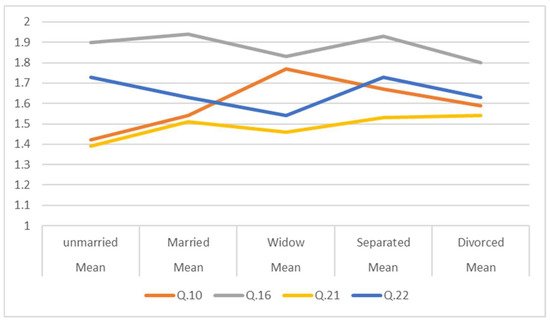 Statistically significant differences also emerged in relation to marital status. The difficulty faced by women in managerial and decision-making positions (Q10) (F (4, 993) = 5.42, p = 0.000), the significance of female digital entrepreneurship in the 21st century economy (Q16) (F (4, 989) = 4.45, p = 0.000), the equal motivation of men and women for ICT studies and careers (Q21) (F (4, 996) = 3.92, p = 0.004), the existence of a gender gap in both computer professions and new professions linked to new communication technology (Q22) (F (4, 994) = 3.33, p = 0.010) showed statistically significant differences related to marital status (Figure 5).