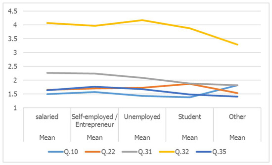 Finally, statistically significant differences were noted in relation to the difficulty women face in managerial and decision-making positions (Q10) (F (4, 994) = 4.14, p = 0.002), the existence of a gender gap in both computer professions and new professions linked to new communication technology (Q22) (F (4, 995) = 3.37, p = 0.009), the level of competence in ICT skills (Q31) (F (4, 922) = 6.39, p = 0.000), the willingness to expand their knowledge in ICT (Q32) (F (4, 993) = 3.95, p = 0.003), and the importance of social media in business (Q35) (F (4, 989) = 4.64, p = 0.001), related to the employment status of the participant in the survey (Figure 6).