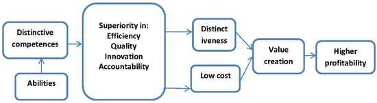 The roots of competitive advantage []. Four factors help the company to establish and retain competitive advantage, namely superior efficiency, quality, innovation, and accountability to customer. Each of these factors are the result of a distinctive competence of a firm. Indeed, they are to some extent generally distinctive competences allowing a firm to make its products distinctive, offer higher value to customers, reduce its cost structure, etc. [].