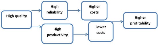 Ren et al. [] showed that high-quality services created positive emotions in customers. Moreover, higher efficiency and lower price are achieved by high-quality products. The effect of quality on profitability is presented in Figure 2.