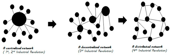 In the traditional information age, information technology has acted as an adhesive between different disciplines or technologies. However, with the introduction of artificial intelligence, the separation of intelligence and recognition and the fusion of virtual space and actual space were achieved. The First and Second Industrial Revolutions constituted a centralized network, and the Third Industrial Revolution constituted a decentralized network in which powerful hubs were dispersed. On the other hand, the Fourth Industrial Revolution constitutes a distributed network wherein all connection points have equal power as shown in Figure 2. In other words, society is becoming more and more closely connected with the interaction of many stakeholders and environmental changes, and the danger is becoming increasingly sociable because there are too many contacts between environment and environment. From a market perspective, the size of the market grows, and the product is a multiproduct society that is personalized.