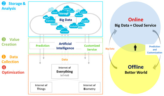 Necessary actions must be taken for the self-organization of each institution to transform time, space and humans in the real world into Big Data in the virtual world. Then, AI can provide estimations and customizations based on big data. The Fourth Industrial Revolution in technology takes the results out to the real world by analog transformation as shown in Figure 3. In this process, Big Data is the most important asset of initiation, because AI is a commodity. However, we must remember that investigation of human desire is most important for future business.