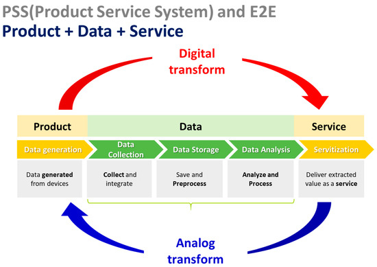 The secret of Unicorn Company is an example of convergence of the real and virtual worlds. The trend of future business is integration of the business value chain called end-to-end (E2E) integration, as shown in Figure 6. Hardware and software are combined to connect products and services (PSS). Thus, unmet human desires can be satisfied through convergence of the real and virtual worlds.