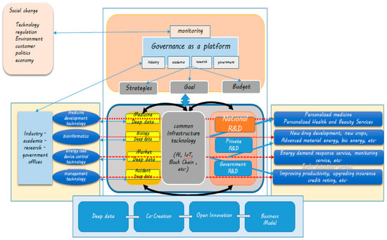 To support start-ups and venture start-ups related to the Fourth Industrial Revolution, we should support convergence research of databases among various industries, while actors within the same industry should share the supply chain through governance as a platform as shown in Figure 7. In particular, a deep data distribution market for artificial intelligence development should be established.