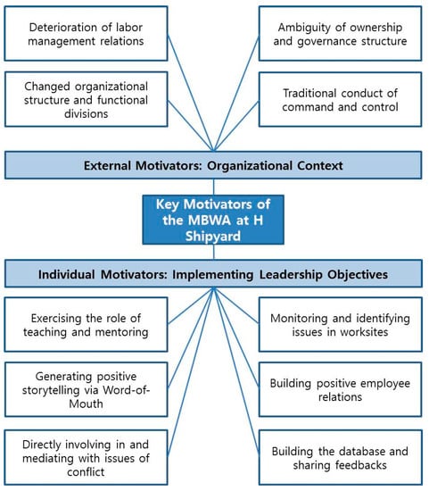 Based on the emergent business concept of management by walking around, this case study intended to answer two modal research questions: (a) What are the organizational and individual motivators of MBWA? (b) What are the communicational factors underlying in these motivators? Using the lens of a management team at a large organization of a Korean shipyard, this research highlights the following findings in terms of the first research question.