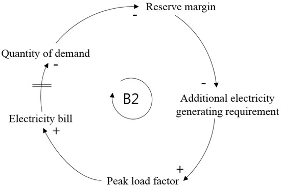 The B2 loop represents a causal relationship between changes in power reserve ratios affecting peak load ratios and changes in the electricity bill, and the ultimately changing demand for electricity. Decreasing the power reserve ratio increases the demand for additional power production to cope with unexpected situations, such as power outages. Therefore, if additional power is generated, the peak load ratio will be higher than the existing equipment, so the electricity bill will increase relatively. In other words, a lower reserve margin brings a higher peak load factor because, we should generate more electricity to prevent the blackout. As a result of this, the demand for electricity is reduced, so that the power reserve ratio becomes higher. This leads to a balanced loop in which the overall power demand relationship is stabilized.