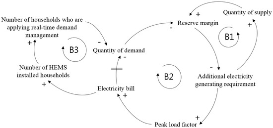 As a result of the above-mentioned causal relationship between electricity demand and demand, the management of demand for electric power was unstable due to mutual imbalances caused by the delay in delivery of the electric charge information to consumers. However, the introduction of the HEMS expressed in the B3 loop made it possible to transmit real-time information, so that demand could be adjusted simultaneously with the recognition of the electricity bill. In other words, based on the result of collecting real-time electric power usage information derived through HEMS, it is possible to provide a condition for the consumer to perform active demand management on their own. Based on the electric power demand data collected by HEMS, Korea Electric Power Corporation (KEPCO) can adjust the supply amount by reducing the error of power demand prediction. In addition, it is possible to stabilize the power supply and supply by balancing the power generation and demand through adjusting the peak load ratio to secure the power reserve ratio. Based on the effects of HEMS, we can see a new causal relationship that can solve the existing power supply and demand problems.