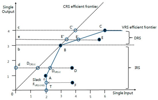 In Figure 1, point DCRS-I is the efficiency frontier point, projected point, or target point of point D in the input-based CRS model assumptions. In other words, in the input-based CRS assumptions, point D must move to point DCRS-I so that the efficiency becomes 100%. Similarly, in the input-based VRS assumptions, point D has to move to point DVRS-I for 100% efficiency. Thus, the target point of point D differs depending on the assumptions that are used [35].