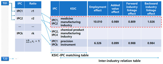 In Figure 3, the technology sector (T01) is represented by the international patent classification (IPC), which is derived from the searched patent documents. It is also possible to calculate the ratio based on the frequency of appearance of the derived patent classifications. In other words, the technology sector (T01) can be defined as the ratio of appearance of the IPC. Four economic effects should be derived for each technology sector; however, the inter-industry relation table provides the values by Korean industry classification. Therefore, we used the Korean Standard Industry Classification-International Patent Classification (KSIC-IPC) matching table provided by the Korean Intellectual Property Office [45] to obtain the four economic effects for each technology sector. If the economic value provided by the industrial classification multiplied by the ratio of the IPC matches the classification, the economic effect value of the technology sector (T01) is obtained. This process was applied equally to all four economic effects. Note that the text and numerical values shown in Figure 3 are conceptual examples and not actual values. On the other hand, the industry association table does not announce the actual value every year. The most recently announced data release was in 2016, corresponding to a base year of 2014.