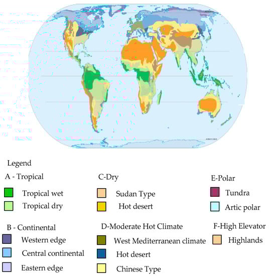 The world consists of various continents which cover various countries. Each of the continents has a different climate, influenced by geographical factors in some areas. The world climate is comprised of 12 clusters of 6 different zones, which are zones A, B, C, D, E, and F. Zone A can be found along the equator, which has an equator climate. As depicted in Figure 1, the climograph for zone A temperature and the range of rainfall are fair throughout the year. The average temperature of zone A is around 26–27 °C. While in zone B, the climate is a tropical monsoon. The tropical climate of Sudan is a hot desert climate, which is dry because of the latitude location far from moisture-bearing winds. Usually, this climate can be found in North Africa and the interior of Southern Africa. Sometimes the B climate can be found in Central Asia, like in China. For zone C, the climate is a moderate to a hot climate that is typically 30 °C to 45 °C. Other climates are the West Mediterranean climate, Middle continental (Steppe Type), and Eastern suburbs (Chinese Type). These types of climates can be found in large areas in the Northern Hemisphere to lesser of the south of equator line. Zone D is located in cold areas that cover the Western edges (British type), Central continental (Siberian Type), and Eastern edge. Zone D climate occurs around the mid-latitudes, which exist in Northern America and Asia. Another zone is a cold zone, which is zone E, and it exhibits an Arctic polar climate (Tundra type). The other zone is F zone, which is alpine climate [].