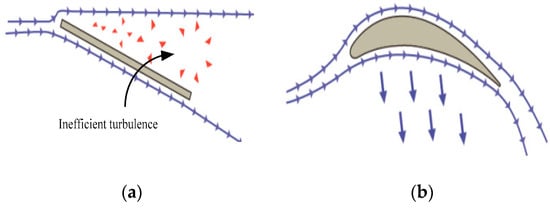 Efficiency plays an important role in selecting a fan. The fan blades act as the main component to push the air downward and provide a comfortable feel in the selected areas. The fan blade profile is one of the major factors involved in increasing fan efficiency. Previously, as in Figure 3a, the conventional fan blades have a flat and fixed nominal tilt design. The flat design is cheaper and requires fewer times constraint to produce it. But it also has a few disadvantages, which are due to the profile shapes not being effective at distributing air and poor performance of the fan blade configurations, which lead to large losses []. Thus, much improvement had been done to enhance the fan’s efficiency. One of the improvements in the concept design of airfoil fan blades is shown in Figure 3b. In a monstrous fan, the profile of the blade is designed with a variety of shapes and styles from various technologies and fan blade profiles.