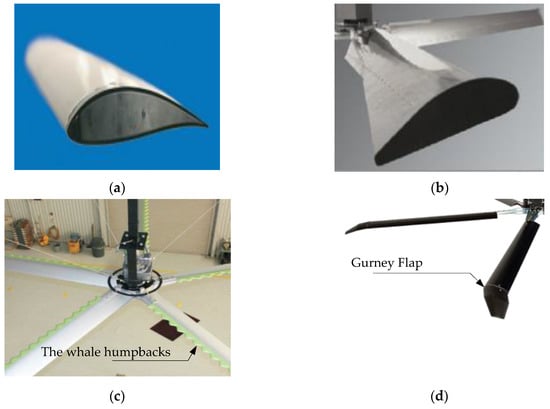 Other blade technologies (a) Whisper Foil XL Blade (Macro Air) (b) Complex contour shapes [] (c) Tubercles fan blades [] (d) Gurney flap.