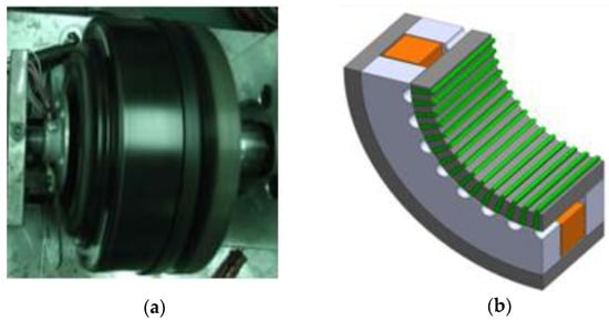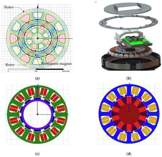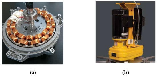 The electric motor is considered to be the primary mover of the large ceiling fan. The electric motor is located in between the fan blades and the mounting system. Previous technologies of various types of electric motor have been developed for this application [,,]. One is the Induction Motor (IM). Previously, the table fan type or small ceiling fan used a single phase induction motor to propel the system [,,,]. IM architecture consists of stator and rotor parts, as seen in Figure 5a. The fan will rotate since the magnetic flux induces the sequential current, which excites the coil arrangement. IM has several advantages, it is robust and able to function in any condition. This machine has a simple construction, is inexpensive due to the absence of brushes, which make it more reliable. Thus, it indirectly increases the machine demand from the manufacturer compared to other types of machine. There are a few advantages on this motor, such as a less efficient motor when compared to the BLDC motor, less of a power factor, and the motion will generate heat that can reduce the efficiency of the motor.