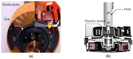 Usually, there are two types motor drives used in monstrous fans; a geared driven mechanism and direct drive mechanism or gearless driven. A geared motor mechanism, as in Figure 8a is a type of motor that transfers the power to the fan by using a gear mechanism, which is connected to the electric motor and the hub structure []. Other than that, the geared DC Motor is used to rotate the ceiling fan down rod or tilt the down rod, further tilting the whole ceiling fan. This type of motor drive is a type of electrical motor that is able to produce high torque while maintaining low horsepower, or a low speed motor output, but it has a few limitations such as noise and vibration due to the connected gear. In meantime, a gearless motor is a type of motor with no gear mechanism required. Without a gear, the system only will be connected directly with the electric motor as in Figure 8b []. The advantages to using the gearless motor are high torque productions at low speeds that are more efficient and lack noise and vibrations.