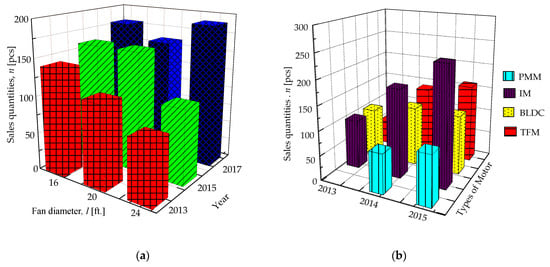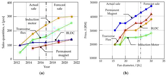 The electric motor is the main important part of a monstrous fan. The ability of a monstrous fan and its performance depend on the motor that drives the blade. Based on Figure 14a, the forecasting sales according to motor types showed that the induction motor still leads as the manufacturers’ choice. The increased percentage as shown in Table 5 shows about 26.6% for an induction motor, 18% for a permanent magnet, 28.5% for a transverse flux, and 7.6% for a BLDC motor. The increment of the induction motor percentage sales is possible due to the price of an induction motor, which is cheaper than other motor types. Besides that, the simple construction and reliability of the fan industry attract manufacturers to use this type of motor compared to the permanent magnet and BLDC motor. Through forecasting, transverse flux will also experience a high increment number in sales. This increment is due to the influence of the branding name, which is able to provide a good perception towards end users.