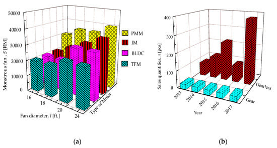 Figure 9b shows the findings on monstrous fan sales volume according to motor types for the years 2013, 2015, and 2017. For 2013, many monstrous fans used a Brushless DC motor (BLDC) and Induction Motor (IM) as the propeller for the fan in 100 numbers, respectively. Only 50 numbers used a Transverse Flux Motor (TFM) and others chose other types of motor as the fan propeller. By the year 2015, the induction motor was leading with 180 sales volumes followed by BLDC and Transverse flux with 120 and 140, respectively. In this case, even BLDC technology is widely used in the industrial market. But in fan applications, these types of motor are still new and not as accepted. Besides that, only 80 sales quantities of monstrous fan were distributed that used the Permanent Magnet Motor (PMM) as the electric motor. Meanwhile, for the year 2017, the induction motor remains an option as a fan propeller with 240 numbers among the monstrous fan companies. According to the trend line, the quantities distribution of this product is slowly decreasing from year to year, from 2013, to 2017. Instead, the quantities distribution according to type of motor increases from 2013, 2015, and 2017.