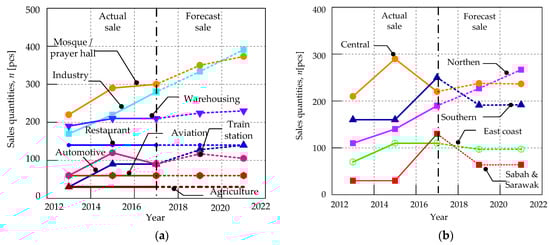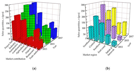 Figure 11a shows the companies’ sales of monstrous fans according to market contribution in Malaysia. For the year 2013, 2015, and 2017, dominant sales quantities of monstrous fans distribution by market contribution were from industrial and mosque/prayer halls. This is due to prayer halls and industrial spaces having large areas that require cooling and comfortable surroundings. The lowest market contribution is from the agriculture sector, which is about 60 numbers for three years successively. In Malaysia, the monstrous fan is still new to the agriculture market sector. Usually, in the agriculture sector, the monstrous fan will be installed in barns, dairy farms, or horse stables that have a large area and a high building structure from the ground. In Malaysia, not all barn structures and dairy farms are modernized, which affects the sales volume. Hence, based on the trend line, sales volumes in recent years have slightly increased for each market, excluding the agriculture market, airport, aviation, and restaurant. From this, it can be concluded that a monstrous fan is still new in the automotive, aviation, and airport sectors.