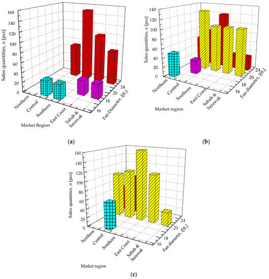 Figure 11b shows the sales of the monstrous fan according to regions in Malaysia. Based on the chart, it shows that the sales of monstrous fans are concentrated at the central region, which dominated with about 210 numbers for 2013. Here, the central region consists of Selangor, Negeri Sembilan, and Kuala Lumpur. The southern region consists of Melaka and Johor. For the east coast, the regions are Pahang, Kelantan, and Terengganu. For the year 2015, the dominant region for monstrous fan distribution is located in the central region, which is about 280 numbers. This shows that the central region contributes a large amount of monstrous fan sales, because almost all big companies are located at the central region. Thus, the marketing was focused in the central region. For the year 2017, the dominant region is the southern region, with about 250 numbers. But through the trend line, from the years 2013, 2015, and 2017, the quantity distribution of monstrous fans is increasing according to the regions in Malaysia.