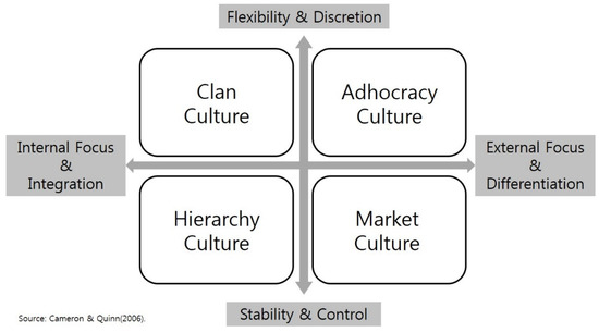 According to the CVF, organizational culture types can be divided into four categories, based on two dimensions—namely, internal versus external, and control versus flexibility (see Figure 1) [6]. The four models and their cultural characteristics are as follows. First, the clan model is a consensus culture that focuses on human relations and emphasizes integration and flexibility within the organization. It stresses values such as unity and cooperation and is characterized by a human and family atmosphere that focuses on the care of and attention to its members. Second, an adhocracy culture is characterized by adaptation, change, and elasticity with respect to the external environment. It emphasizes the importance of the organization’s development and growth in adapting to environmental change, and it values creativity, adventure, and conductivity within the organization. Third, a hierarchical culture aims to maintain integration, stability, and status within the organization. In other words, it emphasizes those values and norms of a traditional bureaucracy that speak to official orders, rules, surveillance, and control. Finally, a market culture emphasizes productivity in achieving organizational goals, based on an external orientation and stability. The values stressed in a market are productivity, efficiency, and rationality. Ultimately, the CVF shows that the organizational culture phenomenon is about culture types coexisting and combining with each other, rather than about one culture type exclusively dominating the organizational culture.
