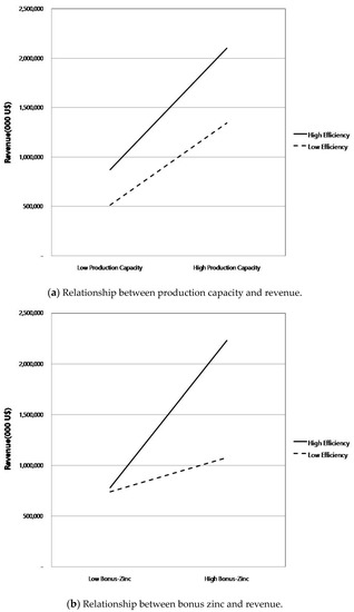 In this study, we analyzed the effect of efficiency in relation to production capacity/bonus zinc and revenue. For the analysis, two groups were classified into high and low according to the production capacity of the zinc smelter. Figure 1a shows the effect of production capacity on sales revenue by efficiency level. As can be seen from the figure, the difference in sales is larger according to the efficiency group when the production capacity is larger than the difference in sales due to the efficiency group when the production capacity is small. That is, it can be seen that there is an effect of efficiency. Regardless of the difference in production capacity, we can see that the sales performance of the high-efficiency group is higher. Therefore, it can be seen that efficiency has an important effect on the increase of sales. This is consistent with the results of Ping Wei et al. [13], because the efficiency of the scale is maximized when the production capacity is large and the efficiency is high.