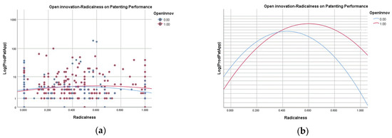 Inverted-U curve of patent application performance: open vs. non-open innovation firms: (a) Log (Patent Application)-Radicalness; and, (b) simplified with fitting curve.