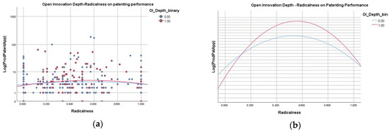 Table 3 presents the overall regression results. The first column, Model 1, includes the open innovation dummy, where the interaction term between the “radicalness” variable and the dichotomous “open innovation” variable is positive and statistically significant. This proves that there was a shift in the optimal balance between radical and incremental innovation. Figure 1b shows the shift toward radicalness. In addition to Model 1, the soundness of this finding was once again supported by Model 2a, where the coefficient of “radicalness” was positive and statistically significant at the 5% level. We selected another subsample, Model 2b, for firms with a positive open innovation depth. Model 2b also identified the coefficient of “radicalness” as being positive and statistically significant, and Figure 2b presents the graphical result of this. To summarize, a serious open innovation firm (positive open innovation depth) with high performance in applying patents tended to focus on radical innovation slightly more than incremental innovation. In sum, Hypothesis 2 was supported. We could see a shifting balance toward radicalness. The direction of the inverted-U curve shift toward radicalness was in contrast to the case of a previous Thai study [34], where the external linkage (FDI, though it is not tantamount to open innovation) caused a shift toward exploitation.