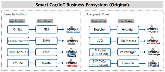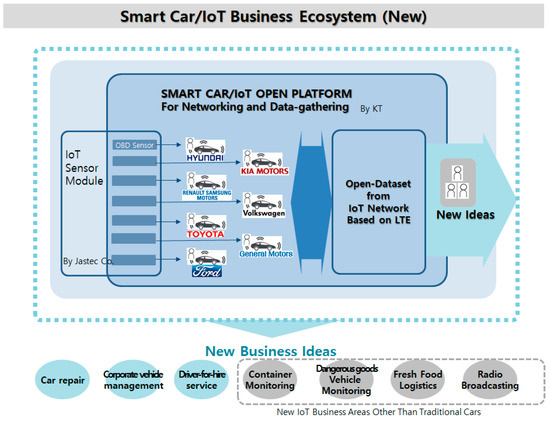 Therefore, it is difficult for latecomers to enter the existing network. These new companies face hurdles when it comes to building an R&D environment, securing Smart Car/IoT data, and building or demonstrating a test bed. Figure 4 shows the original Smart Car/IoT business ecosystem in Korea.