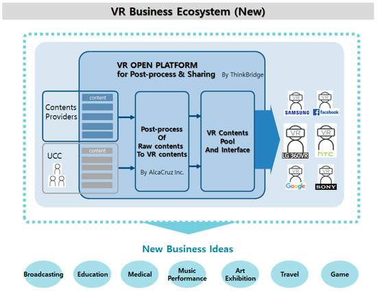 The existing development of VR headsets and their content are composed of closed cooperative relations centered on large companies. Most of these companies, including Samsung, SONY, HTC, and Facebook, operate a closed distribution platform that creates and distributes their own formats. Meanwhile, most of the cost is spent on the post-processing of raw video content to VR content. As a result, there is still relatively few VR content available (This is reminiscent of the 3D TV industry. One of reasons this industry has failed in the past is the lack of 3D TV content. There is not enough production equipment for producing 3D TV and the quality is low. If the VR industry fails to innovate, it will reach a similar end). These two facts make it difficult for latecomers to enter the VR business ecosystem. On top of this, it is also difficult to secure VR content, share, and build a distribution platform.