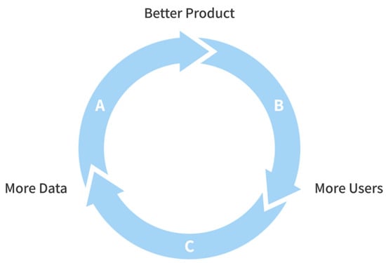 Figure 3. For instance, Google has tremendous data, so it can build an accurate search engine as a product (A). This product enables Google to acquire more users (B), who then create more data on Google (C).