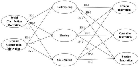 Nam, Ackerman, and Adamic include altruism and the ability to learn as individual motivators of knowledge sharing [35]. Wasko and Faraj include external rewards—a type of individual motivator—as a variable to explain the knowledge-sharing process [24]. The process of sharing knowledge produces joy as it entails the thought of helping others. According to social exchange theory, knowledge contribution motivation variables affect attitudes regarding knowledge sharing, which in turn affects the intent to share knowledge, and the intent to share knowledge is closely related to the act of sharing knowledge [21]. According to the expanded TPB, intent to share knowledge is affected by attitudes regarding knowledge sharing, subjective norms regarding knowledge sharing, technical norms regarding knowledge sharing, knowledge sharing itself, and limitations of knowledge sharing. Thereafter, the intent to share knowledge affects the act of sharing knowledge [36]. Each individual, as one adaptive agent, contributes knowledge, communicates with another, refers to another, votes for others, modifies other’s knowledge, and accomplishes the emergence of mass intelligence [37]. The notion of value co-creation described by service-dominant logic seems to be parallel to that of CI. Some scholars have mentioned that the ability to collectively harness intelligence represents a means of co-creating value in various aspects of modern business [38]. As shown in the above discussion, the assumptions that can be applied to motivation research regarding CI include categories of motivations, such as protective, value, career, social, understanding, and enhancement, as well as contribution motivations, such as cognitive needs, affective needs, and integrative needs [26]. Thus, such individual motivators and social orientation relationships can be expected to affect the onset of CI. Therefore, this study intends to explore two contribution motivations for CI.