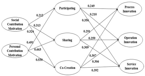 For H3-1, H3-2, and H3-3, the results indicate that collective intelligence building through participation is closely related to process, operation, and service innovation as sub-factors of incremental innovation. The proposed path was statistically significant in the hypothesized direction (collective intelligence building through participation, with a standardized path coefficient for process, operation, and service innovation: γ = 0.249, 0.210, 356, p < 0.001 for H3-1, H3-2, and H3-3, respectively). Thus, hypotheses H3-1, H3-2, and H3-3 were supported.