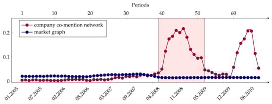 Following ideas of [38,39] the current paper presents a company co-mention network as a graph where the world’s major companies mentioned in financial, business-related, and economic news flow are shown as nodes. If any two companies are mentioned in the same piece of news, the company co-mentions graph shows it as the edge between two nodes. Various important characteristics of company co-mention networks were studied with use of different SNA metrics, such as eigenvector centrality, degree of centrality, betweenness centrality, closeness centrality, frequency, etc. in papers [38,39], and key companies of networks were found. It was demonstrated that the degree distributions as well as the clustering-degree of the analyzed graphs follow a power law, but using a non-typical exponent value. The subgraph analysis in terms of industrial and spatial affiliation allowed for key company identification in the network and the possibility to research the analogous power-law distribution for company co-mention network subgraphs. The QAP analysis method was used in [40] to examine the correlations between the company co-mention network and graphs, describing sectoral (and spatial) affiliation. Papers [38,39] explore how the structural characteristics of the company co-mentions graph change over time, such as the distribution of the vertices degrees, the distribution of the average clustering coefficient, the edge density, the size of maximum clique, its connectivity. It was found that the power-law structure of the co-mention graph is quite stable. The degree exponent as well as the clustering-degree coefficient were at their lowest values during the 2007–2008 financial crisis. All maximum cliques comprise a big amount of companies from banking sector. The maximum independent set was the largest at the peak of the 2008 financial crisis.