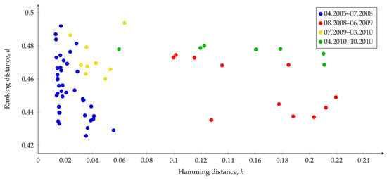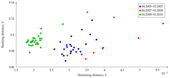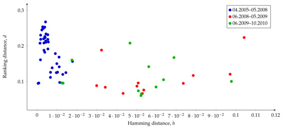 The essence of this method is simple enough and consists of using two different similarity measures and . It is desirable that these measures evaluate different types of graph dissimilarities (for example, topological and structural dissimilarities). As such measures, in the following sections we will use the Hamming distance and the d-measure defined below by Equations (2) and (3). The first measure measures the closeness of the local structural properties of graphs, while the second measures the similarity of the centrality indices of vertices. Then we find the values of the measures and for all neighboring pairs of graphs. Thus, we get points