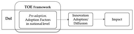 To evaluate the theoretical relationships above, we used the survey data from international organizations. Comparisons between countries are common through the preparation of relevant indicators based on objective statistical work [56]. After establishing two sections: pre-adoption and post-adoption in the innovation phase, the pre-adoption segment with indicators is set up and used as independent variables by applying the TOE framework theory, which can explain innovation phenomena and productivity increases at the national level. The post-adoption section is classified into two: adoption/diffusion and impact according to the classification of the innovation diffusion phase (see Figure 1). The parameters for adoption/diffusion section reflect the characteristics of digital innovation as a result of innovation adoption by digitalization, while the impact segment reflects the economic growth. The survey targets countries in 137 to 212 countries whose measurement results have been continuously accumulated as the International Information Service Index.