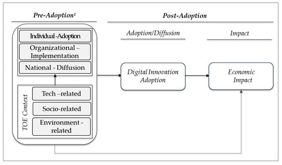 Research Model. Note 1: 1 Pre-adoption part is adapted from Reference [28]. Note 2: We refer to Reference [16], which considers stages of adoption, theories under the categorized innovation format, and a conceptual model for IT innovation adoption process in organizations.