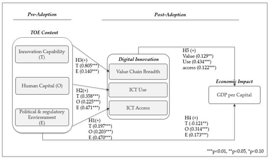 The OECD divided the e-commerce market into stages of introduction, growth and maturity according to the growth phase of the digital economy in the measurement of the digital economy at the national level. For each stage of analysis, the required data is different with focus being on data, related to readiness at the introduction phase, indicating strength of growth at the stage of growth, and related to socio-economic impacts at the stage of maturity. Indeed, in the case of the United States, efforts have been made to analyze the economic impact through digital innovation and to predict its future, presenting five areas in the study of digital economy, including IT infrastructure, e-commerce form, changes in corporate/industrial and market structure, individual characteristics and labor-market characteristics using IT, and price behavior. Some argue that the performance of ICT investments made to date is not adequately measured and that productivity growth is underrated, and that statistics to measure the actual economic impact of computers in the information age are not appropriate to measure the results of digitalization [46]. Therefore, from the perspective of the innovation phase, we present digital innovation: ICT access, ICT use and value chain breadth, as a result of adoption of innovation, apply it as a measurable indicator to verify the relationship with the creation of the nation’s economic performance. We also intend to present and demonstrate that measuring actual economic impact through empirical analysis of direct and indirect channels in relation to innovation capacity factors, represented by TOE.
