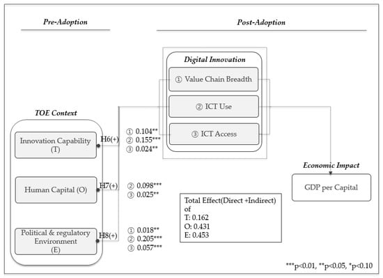 The overall results show that the path from TOE factors to economic impact through digital innovation is all related directly and indirectly except the direct path from human capital to value chain breadth and indirect path through value chain breadth.