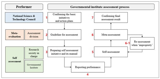 The Korean GI assessment system was established in 1991. Since this system includes assessment and proportional response toward GIs, it assumes the role of a feedback system. Unlike private firms, GIs have focused on the science and technology of public areas that are difficult for universities and firms to access [24]. It is thus important to consider their roles and characteristics when they are evaluated. Figure 1 presents a flow chart of the feedback system for GIs in Korea. The Korean government-organized GI assessment system has three performers who assume unique responsibilities. Each actor plays the role of self-assessment, meta-evaluation, and final decision making.