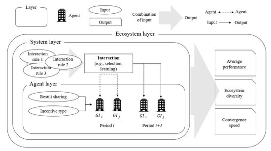 Unlike analytic methodologies, the ABM can interpret social phenomenon based on a bottom-up process. The ABM has the advantage of dealing with unstructured problems, such as ambiguous assumptions, and phenomena controlled by individual levels through simplifying complex systems [68]. Thus, ABM has been used to analyze complex and large sizes of the system through interactions of autonomous entities [69]. In the ABM simulation, since a result is not a sum of parts, the ABM simulation should be modularized into multiple layers [70]. This study assumed three layers consisting of “agent later”, “system layer,” and “ecosystem layer”. Figure 2 presents a detailed description of the ABM simulation research model. “Agent layer” refers to a microscopic level of an ecosystem and includes multiple research institutes, which is the minimum unit of the GI ecosystem. Based on the bottom-up perspective, all decisions are conducted in this layer. “System layer” defines the interaction between the agent layer and the ecosystem layer. Although no autonomous agent exists in this layer, the system layer may express how to interact among agents in given conditions. The “ecosystem layer” provides a macroscopic view to observe emergent phenomena that are being investigated. Similar to the system layer, the ecosystem layer does not have actual agents. However, this layer relays information on the current environment. This information may influence the decisions of each agent. Furthermore, this layer shows macroscopic patterns, such as average performance, diversity, or regular tendency. While each layer can manipulate its own layer, interactions between layers are possible.