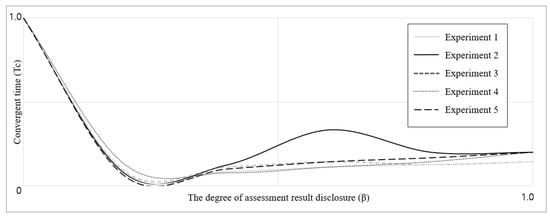 There are two interpretations of shorter convergence time. Firstly, diversity of the GI ecosystem has a higher probability to not be undermined. Maintaining diversity of ecosystems guarantees stability of the system from unexpected changes in the external environment as well as loss of current knowledge. Preservation of system diversity also increases likelihood of emerging new knowledge in the ecosystem, which may lead to improved decisions. GI ecosystem in experiments maintains quantitative diversity in the very low result sharing level According to Figure A2 in Appendix A, the diversity of GI ecosystem is highest when the degree of result disclosure (β) is 0. If the rate of openness is under 0.2, diversity begins to decrease sharply and shows similar levels of quantitative diversity in the rest of the domain. Results of convergence time show that it is hard to maintain high diversity of GI ecosystem except in the range with low degrees of result sharing. However, the loss of diversity when seeking optimum solutions is natural, so the present study emphasizes another aspect to interpret short convergence times. The second implication of the experiment result refers to the possibility of an efficient learning process. The efficiency of organizational learning is a crucial factor because it is difficult to repeat enough organizational learning processes in the actual GI ecosystem, such as in the current model of research. The short convergence time in this study model means that the GI ecosystem reaches its optimal state quickly. Figure 3 shows a relatively short convergence time when the degree of result sharing is higher than 0.2 (β > 0.2). Therefore, the GI ecosystem is efficient at the most openness proportion (β > 0.2), and the inefficiency of the learning process is observed only at a low degree of assessment result sharing.