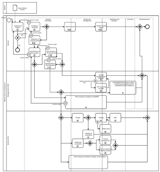 In the area of healthcare [11], the models should reflect straightforward and uncomplicated processes in order to contribute to easy comprehensibility for all parties involved. The associations that implement BPM, namely Business Process Model and Notation (BPMN), are usually interested not only in describing the business process but also in analyzing, predicting behavior, and improving the business process to gain a competitive advantage in the global market. The quality of business (QoBiz) is closely connected with the quality of service (QoS): the former determines monetary profit or loss, while the latter is concerned with performance, security, reliability, and availability [8,12,13]. The product development is based on the transformation of an idea into a commercial product [14]. The first step is to identify the need for such a product. It is followed by identifying customer needs and issues that are solved by purchasing a new product. The following phase involves optimization; the trial product is developed and assessed by a few potential users. Provided that this process is successful, the introduction of a new product starts. In spite of some discrepancies between the product development procedures, a universal approach may be identified. It can bring many benefits, such as facilitating planning, increasing predictability, helping to improve quality, reducing costs, and compression cycle time [15,16,17]. A specialized methodology of product development and differentiation characteristics of medical devices is proposed, for example, in publication [18].